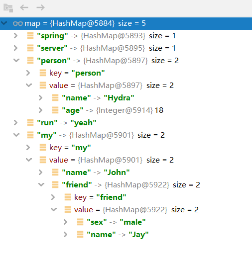 monoToMultiLayer()方法的代码有点长,就不贴在这里了,主要是根据key中的.进行拆分并不断创建子级的Map,转换完成后得到的多层Map数据如下: