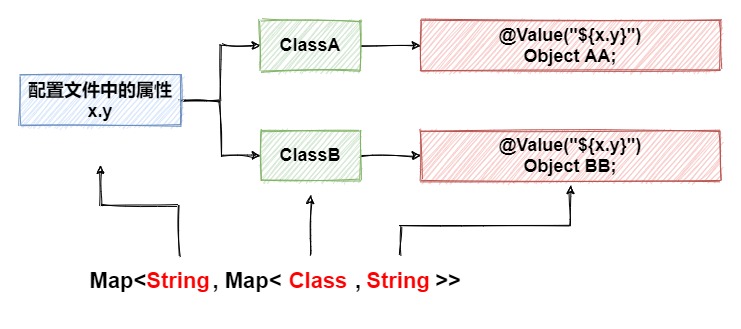 Class对象中所有的属性,并判断属性是否加了@Value注解 @Value如果要注入配置文件中的值,一定要符合${xxx}的格式(这里先暂时不考虑${xxx:defaultValue}这种设置了默认值的格式),所以需要使用正则表达式验证是否符合,并校验通过后去掉开头的${和结尾的},获取真正对应的配置文件中的字段VariablePool中声明了一个静态HashMap,用于存放所有配置文件中属性-类-类中属性的映射关系,接下来就要把这个关系存放到这个pool中