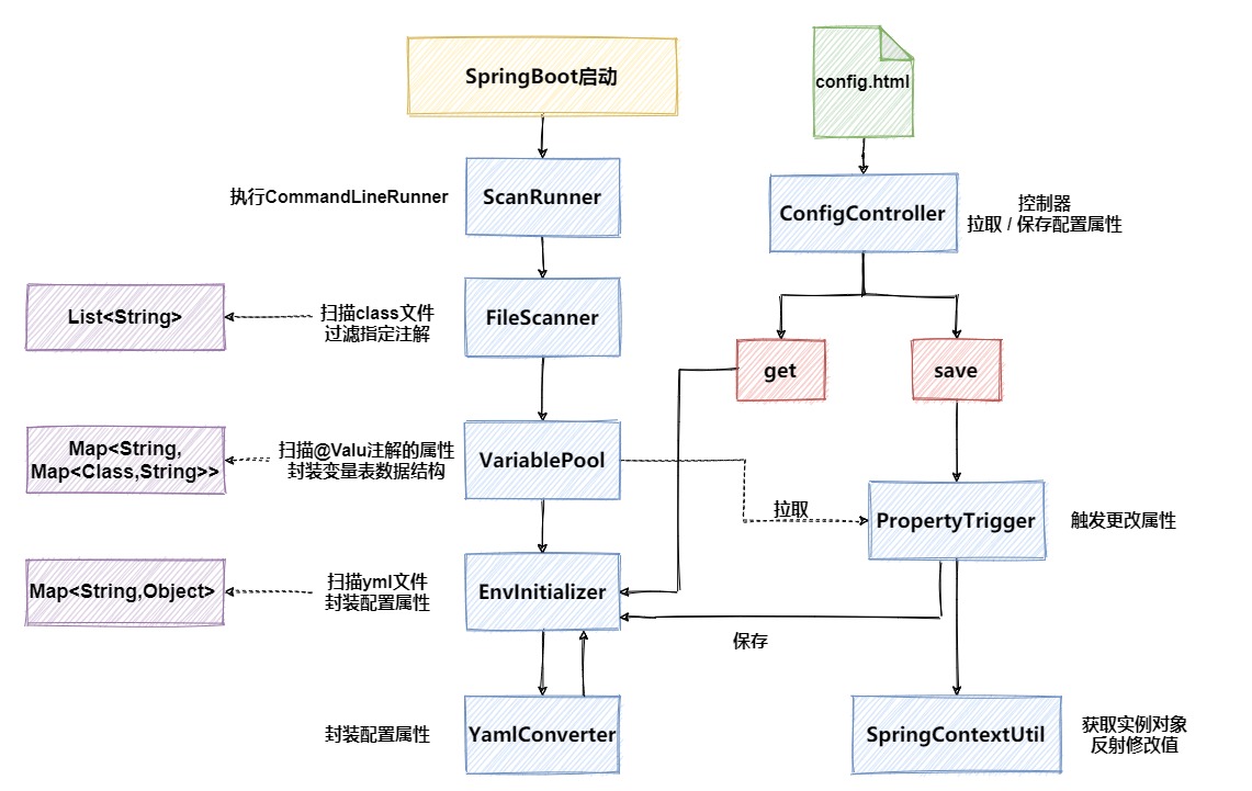 看到这是不是有点好奇,虽说是低配版,就凭这么几个类也能实现一个配置中心?那么先看一下总体的设计流程,下面我们再细说代码。