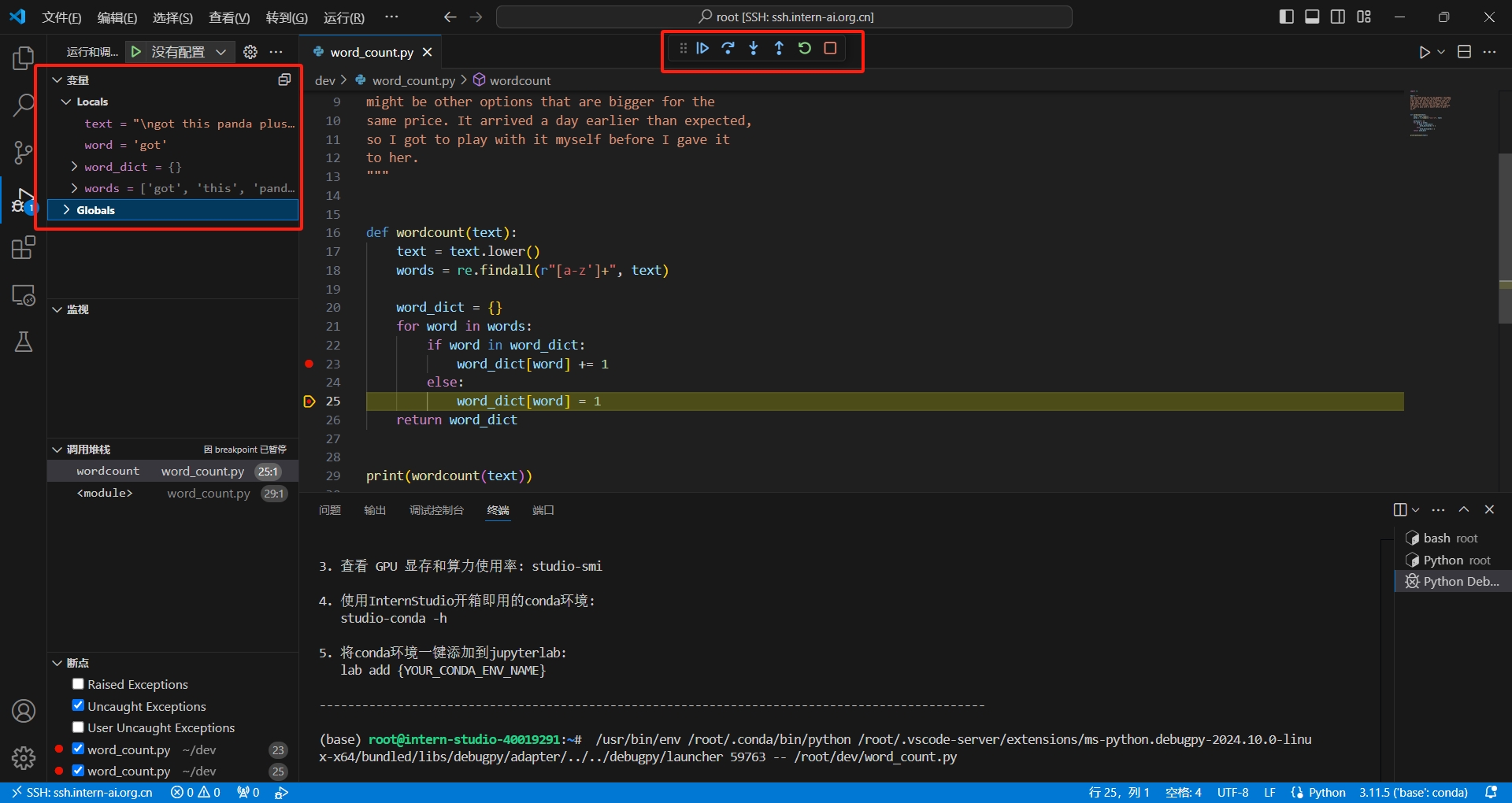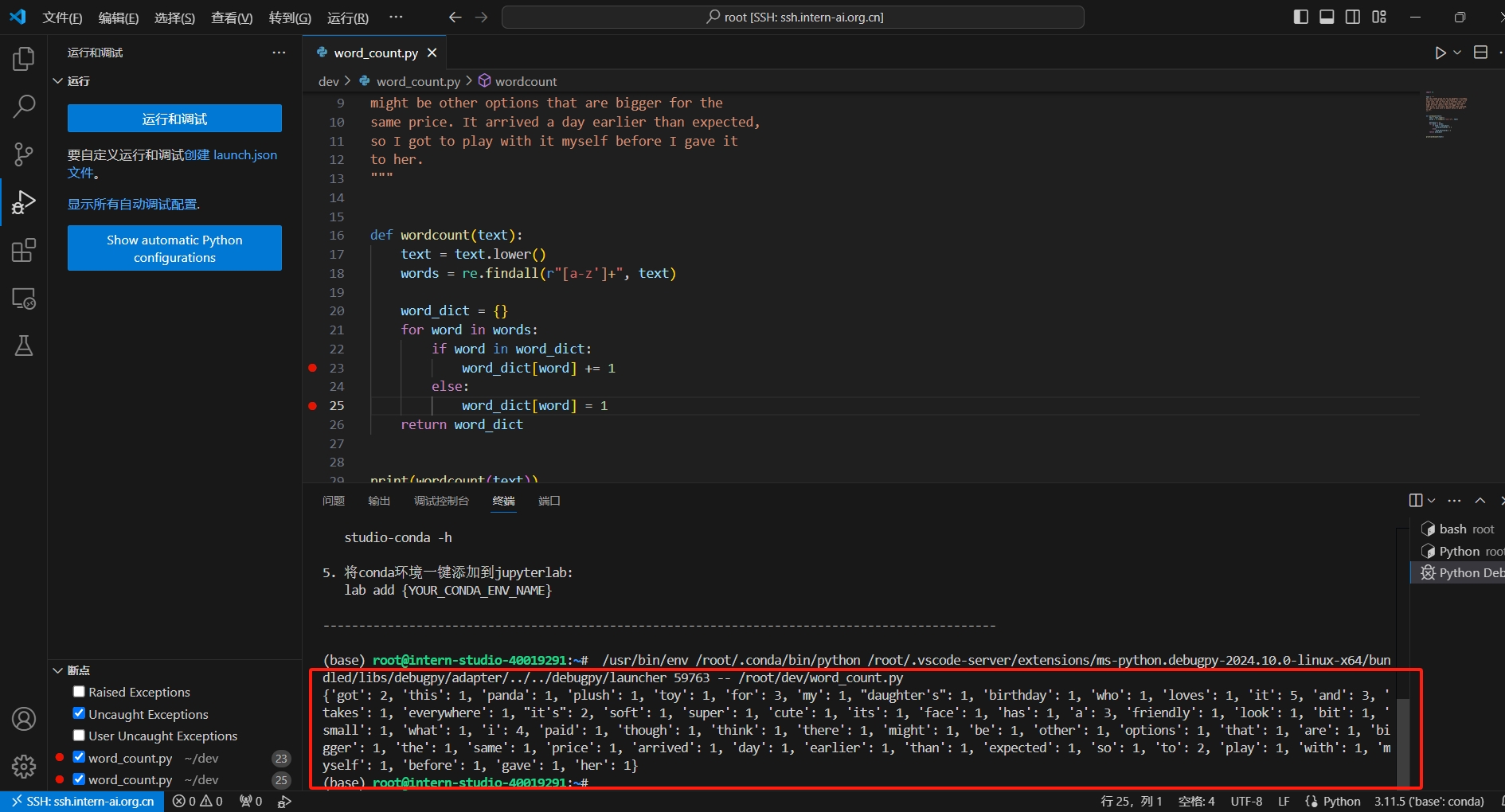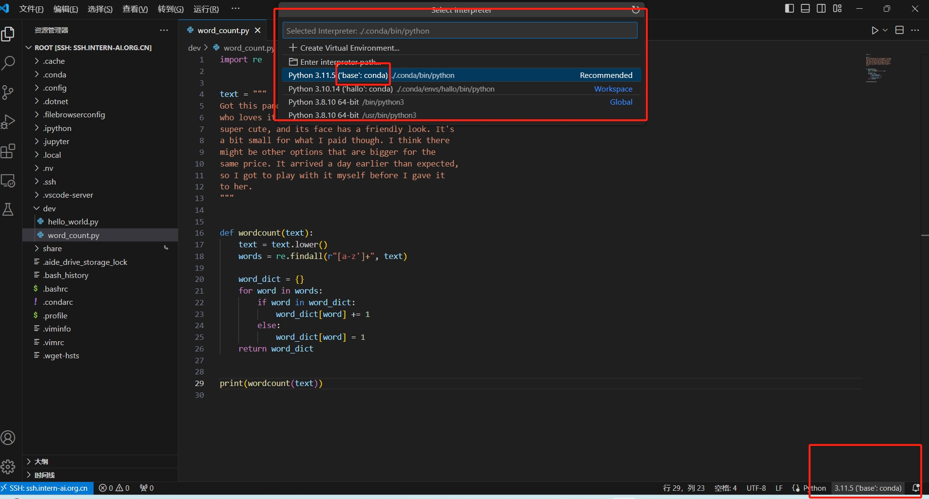 执行前,选择开发机中的python解释器,直接使用conda中默认的base环境: