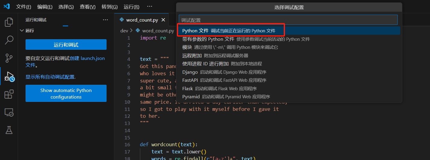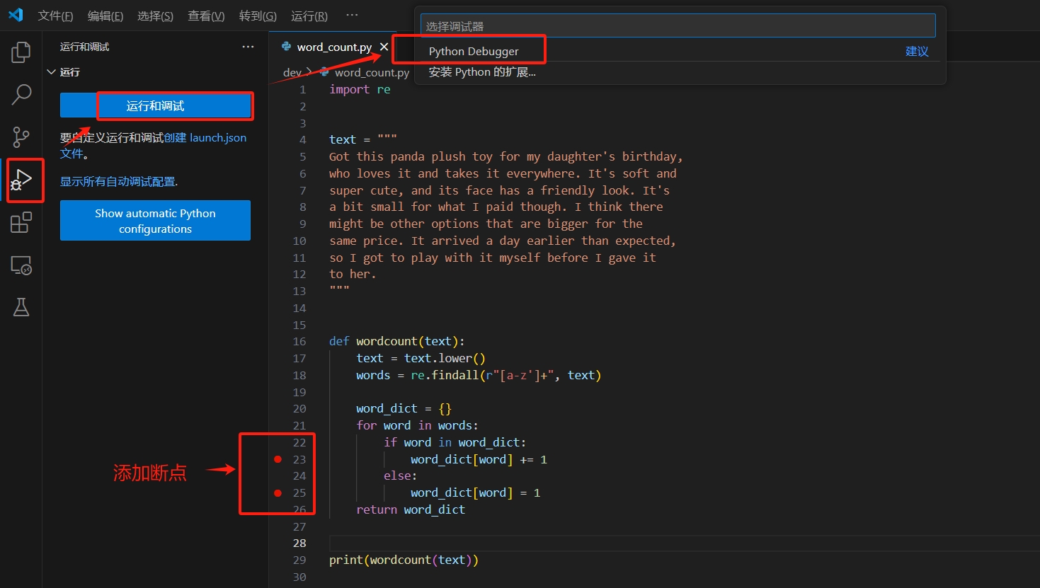 在代码中添加断点后,选择左侧的运行的调试,点击Python Debugger
