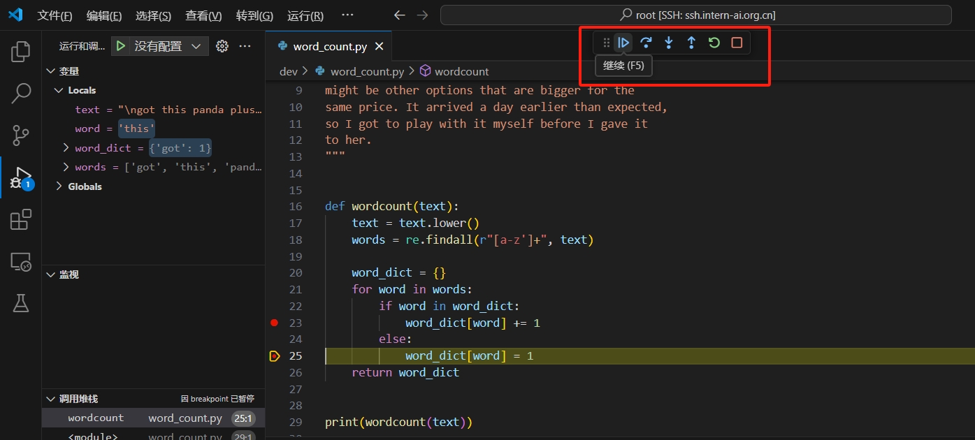 点击继续或按F5可以跳到下一个断点,其他按钮还可以执行单步调试等等功能。