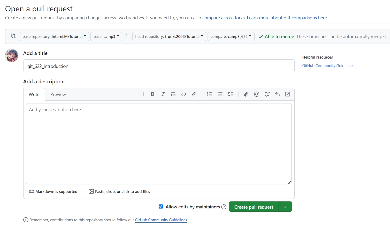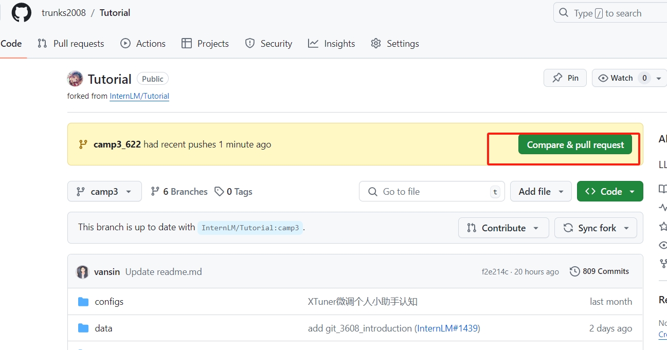 从 https://github.com/InternLM/Tutorial fork一个分支到自己的仓库: