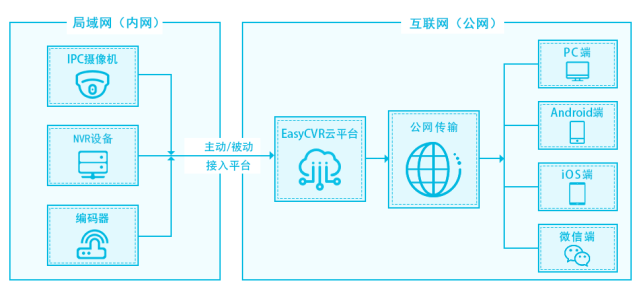 智能化水资源检测系统主要包括四大模块:监控设备、水资源检测设备、EasyCVR视频结构化安防云服务平台和客户端。