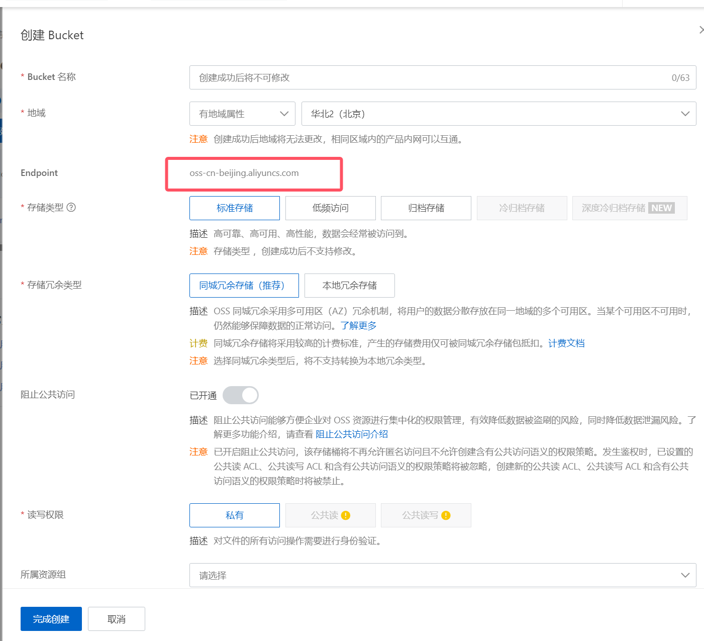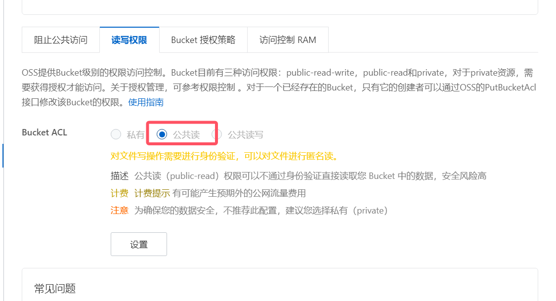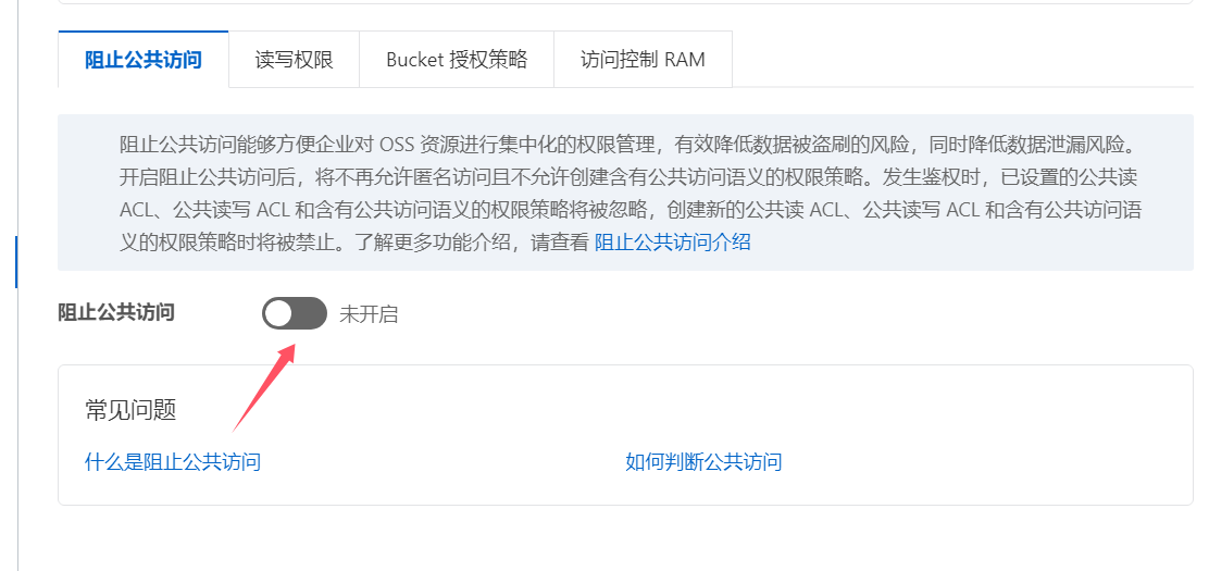 Bukket创建完成后默认为阻止公共进行访问,若需要自己的本地前端访问数据,可以将阻止公共读关闭,并授权ACL为公共读。