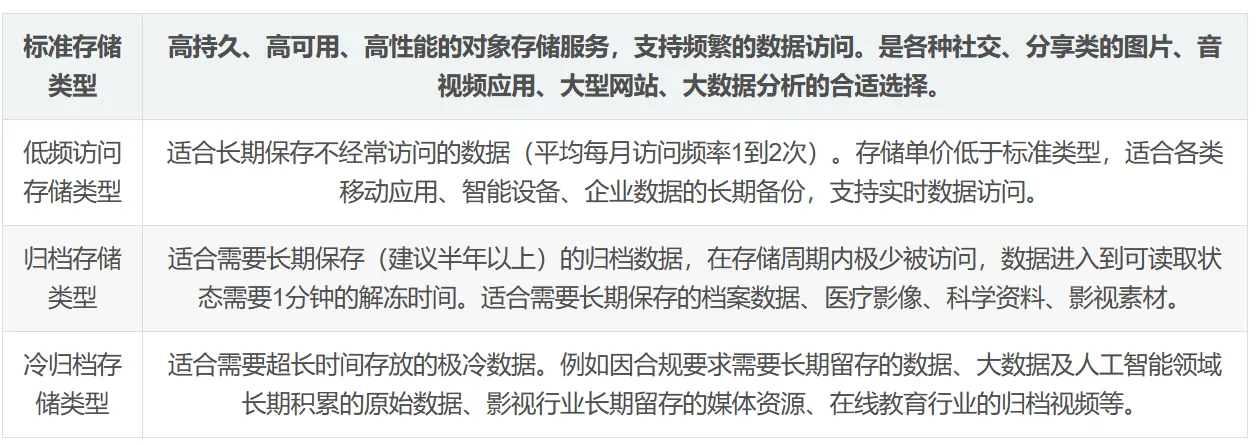 - 提供标准、低频访问、归档和冷归档四种存储类型,全面覆盖从热到冷的各种数据存储场景:
