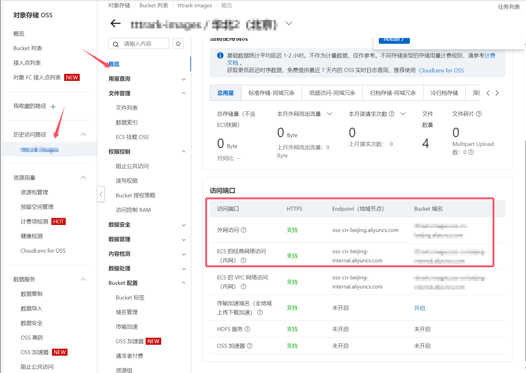 创建Bucket需要记住Endpoint以及Bucket名称,以便后续在配置文件中使用,Endpoint可以在bucket详情中点击概览进行查看。