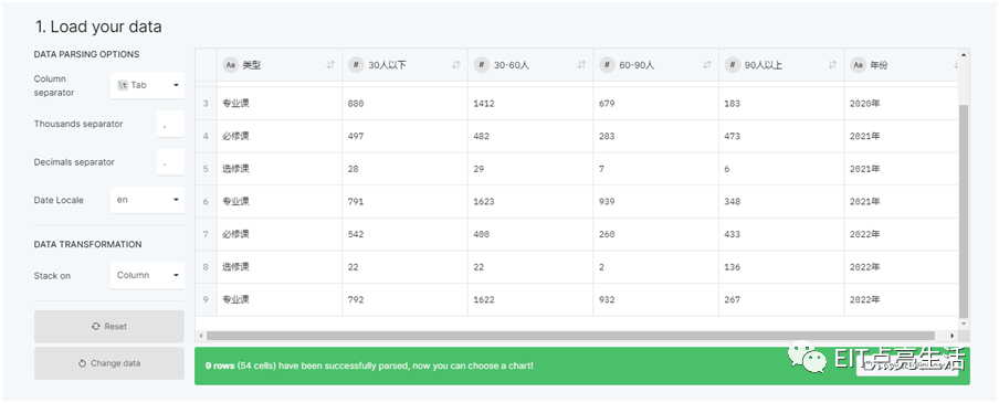 选择粘贴数据,将本地数据拷贝、粘贴到空白处即可,DATA TRANSFORMATION 根据选择的数据项,进行数据表的堆栈化变换。