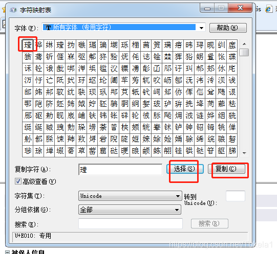 然后在下面会显示一些生僻字,你可以查看下是否有你需要的,如果有的话,就很方便了,选中你的字,然后选择,点击复制,可以在文本编辑器里面将该字体复制出来,但是微信上不可以复制