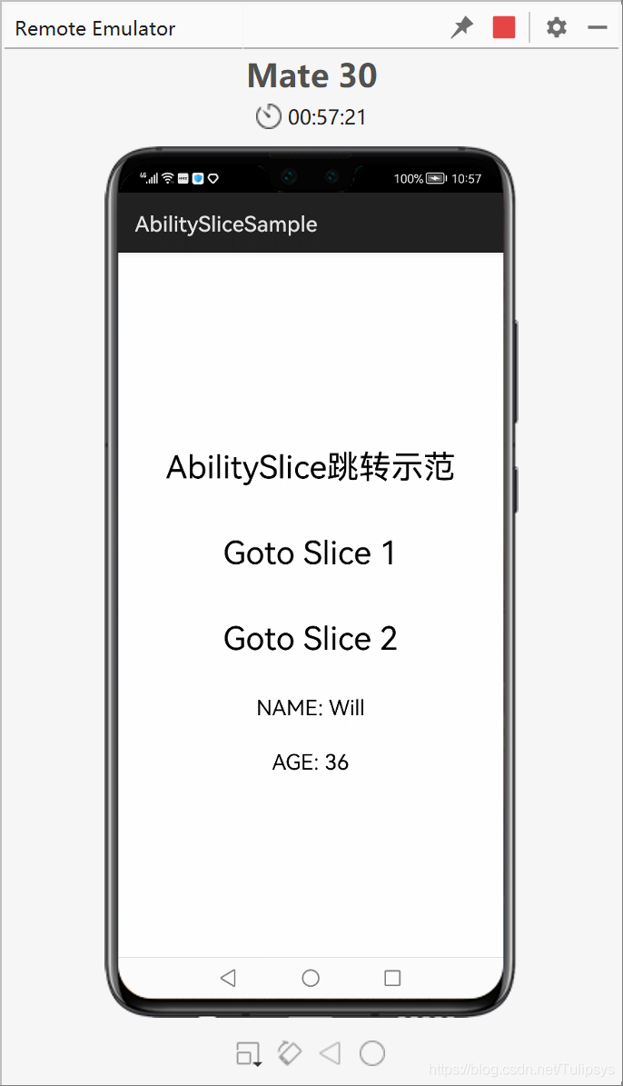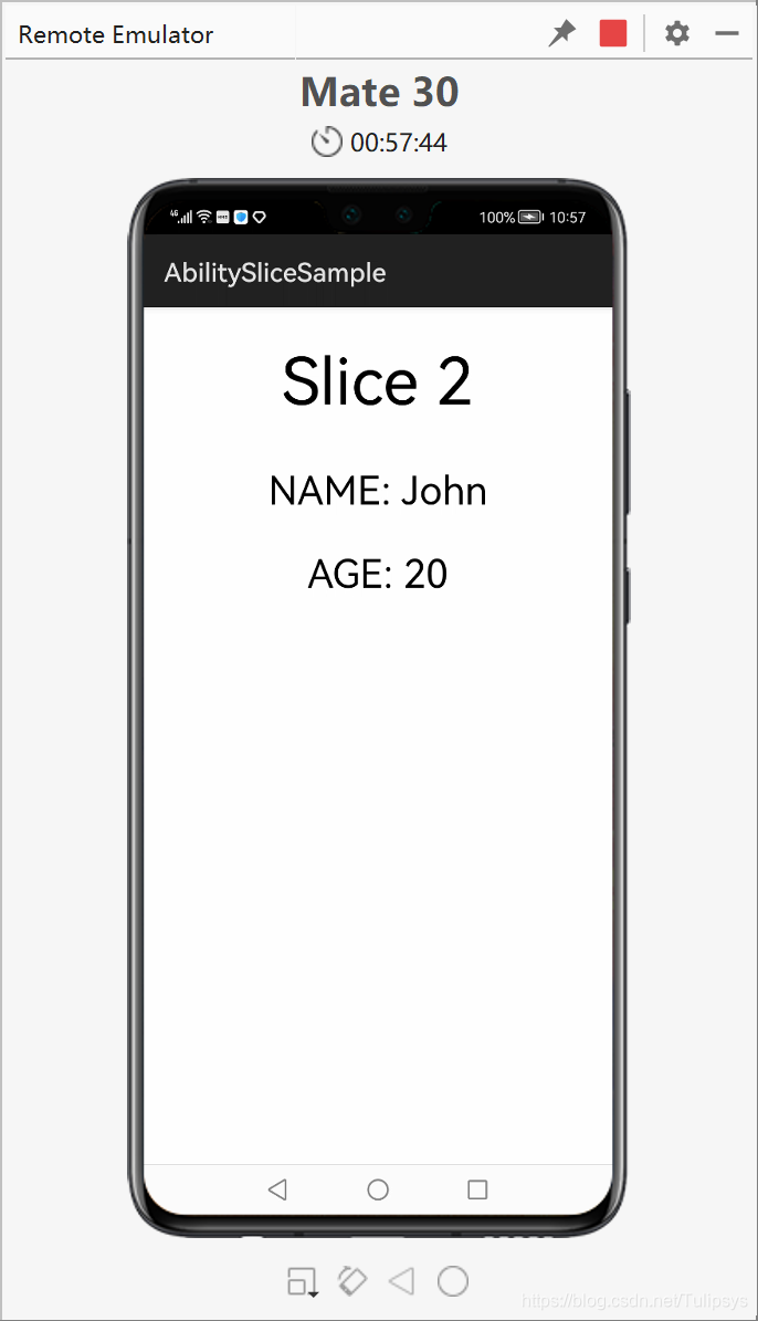 点击button2“Goto Slice 2”,打开AbilitySliceTwo,这儿要传递参数。示例中设置了一个Student类,在打开AbilitySliceTwo的时候把Student的Name和Age数据传递给AbilitySliceTwo。