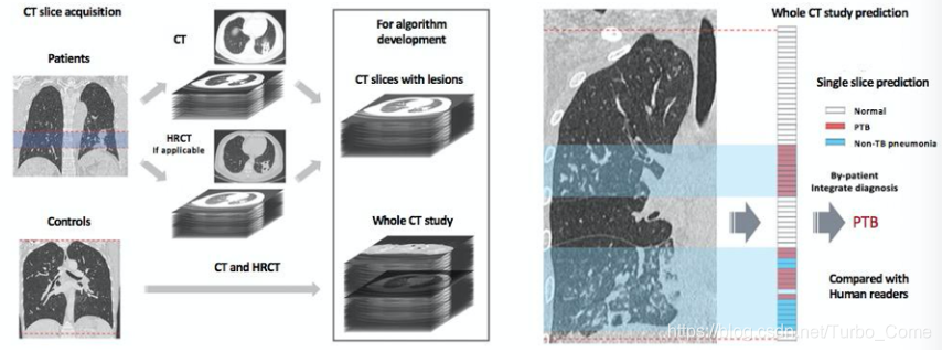 结核型肺炎 Pulmonary Tuberculosis PTB and 非结核型肺炎non-tuberculous(non-TB )的差异是大的,但依靠临床和放射科来判断肺结核的疾病类型仍然很困难,成本高,速度慢。因此,如何应用深度学习技术审核CT图像,协助医生来进行诊断,区别PTB和TB,以及正常的肺部CT图像至关重要。