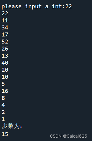 输出:22 11 34 17 52 26 13 40 20 10 5 16 8 4 2 1