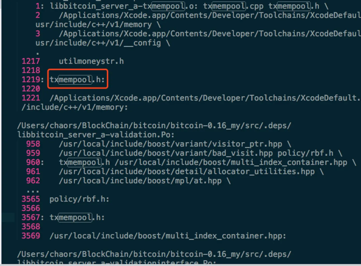 于是,我扩大搜索范围,搜索pool。搜到的结果很多,我大概地往下翻,试图寻找是交易池的那个。找到很多处mempool,于是我点进去试着搜索mempool,找到了txmempool.h这个头文件,交易内存池,应该就是这个了。