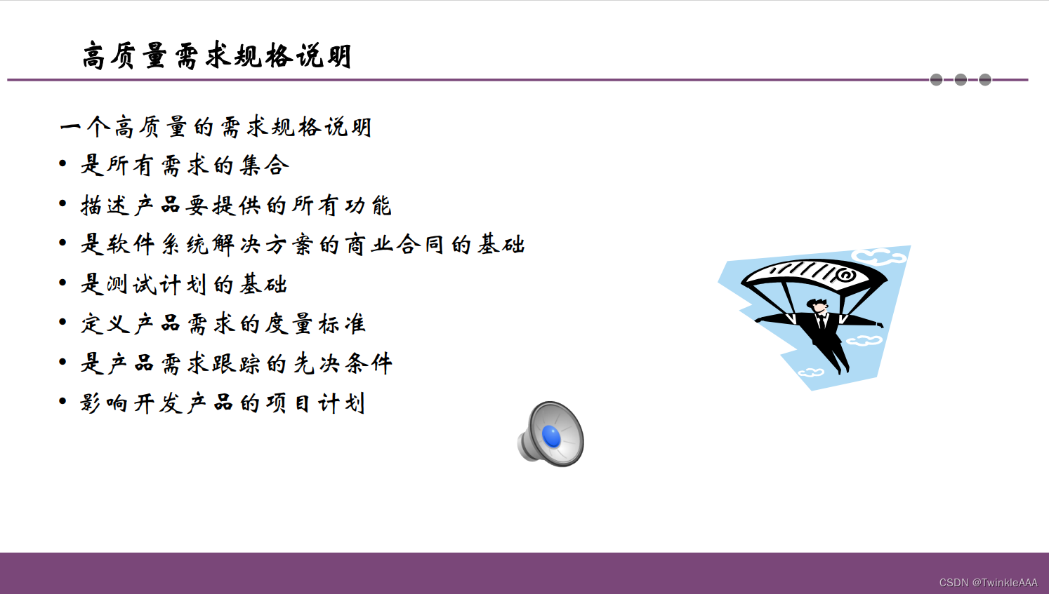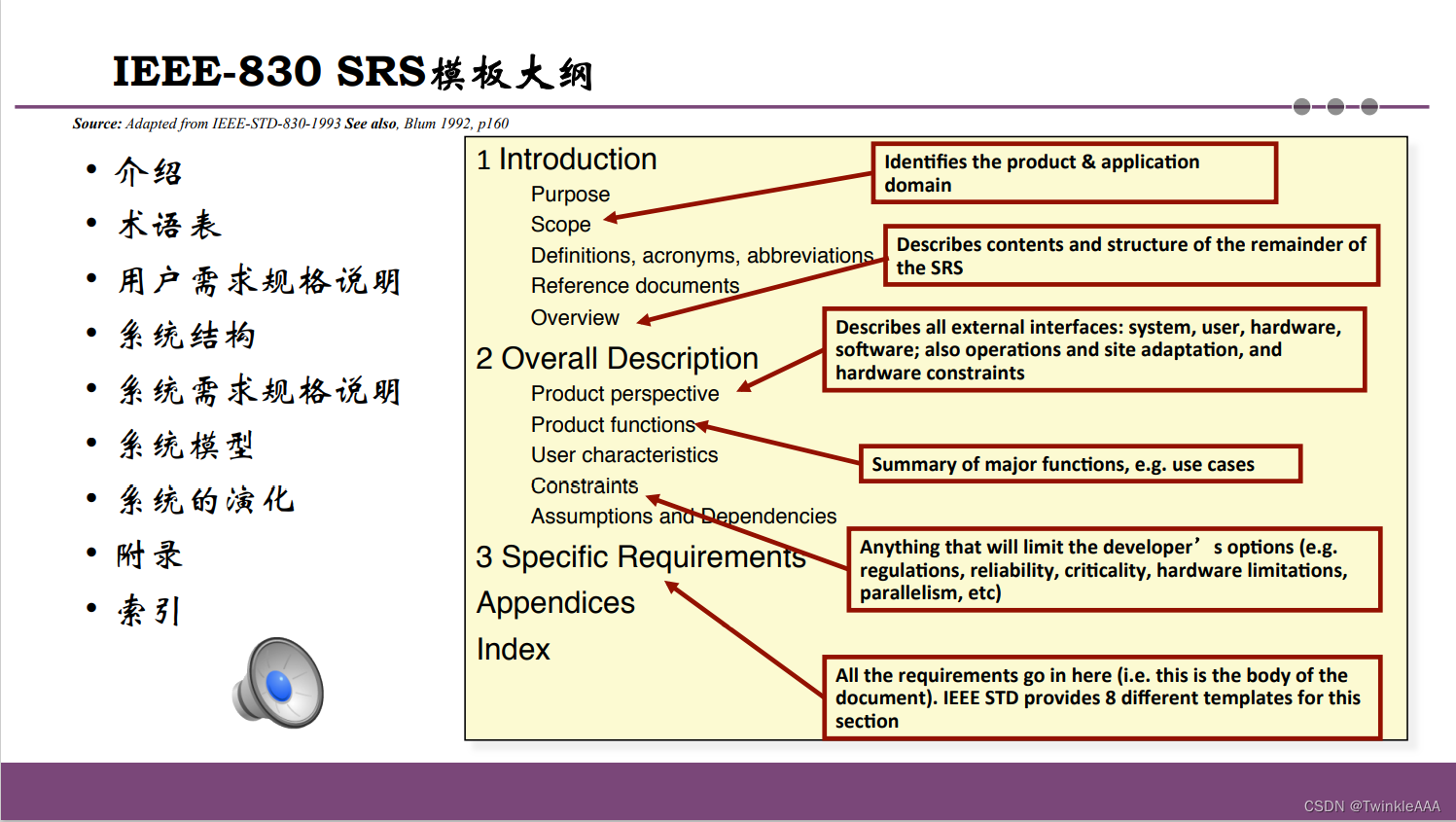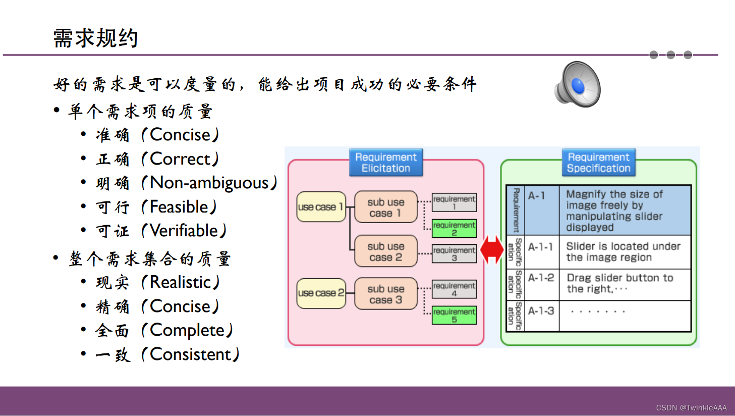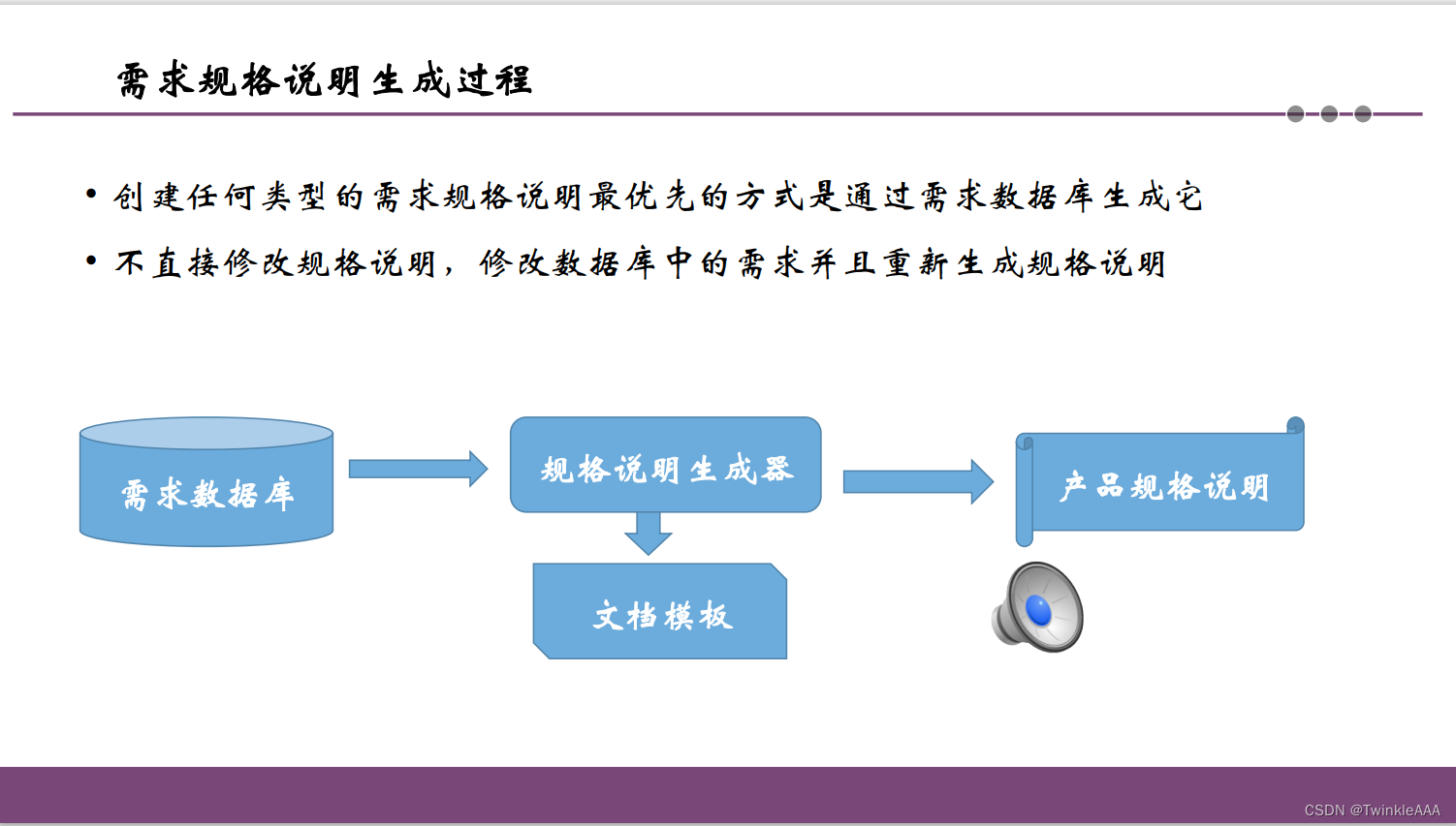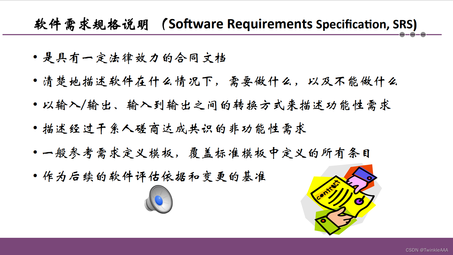 软件需求规格说明SRS的风格是描述性的自然语言文本,撰写用户手册作为一种性价比高的一箭双雕的方法,同时获得SRS和用户手册,用户手册作为SRS对于和用户交互的系统是比较有效的,这样系统由交互驱动。