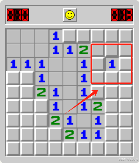 1.我们发现这个代码还没有实现周围遇到0个雷的时候能自动向外拓展,直至出现相邻格子有雷的情况才会停止