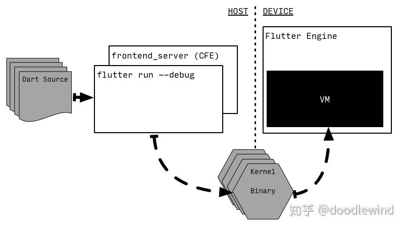 dart2native命令时,Dart 源码会被编译成平台机器码,获得.aot格式的产物。这个产物类似原生的 ELF 可执行格式,可以被预编译出的dart_precompiled_runtime运行时动态加载执行,对应模式 3。 - 在移动端 Flutter 的 Debug 模式下,Dart 源码会在开发者的桌面端被编译成