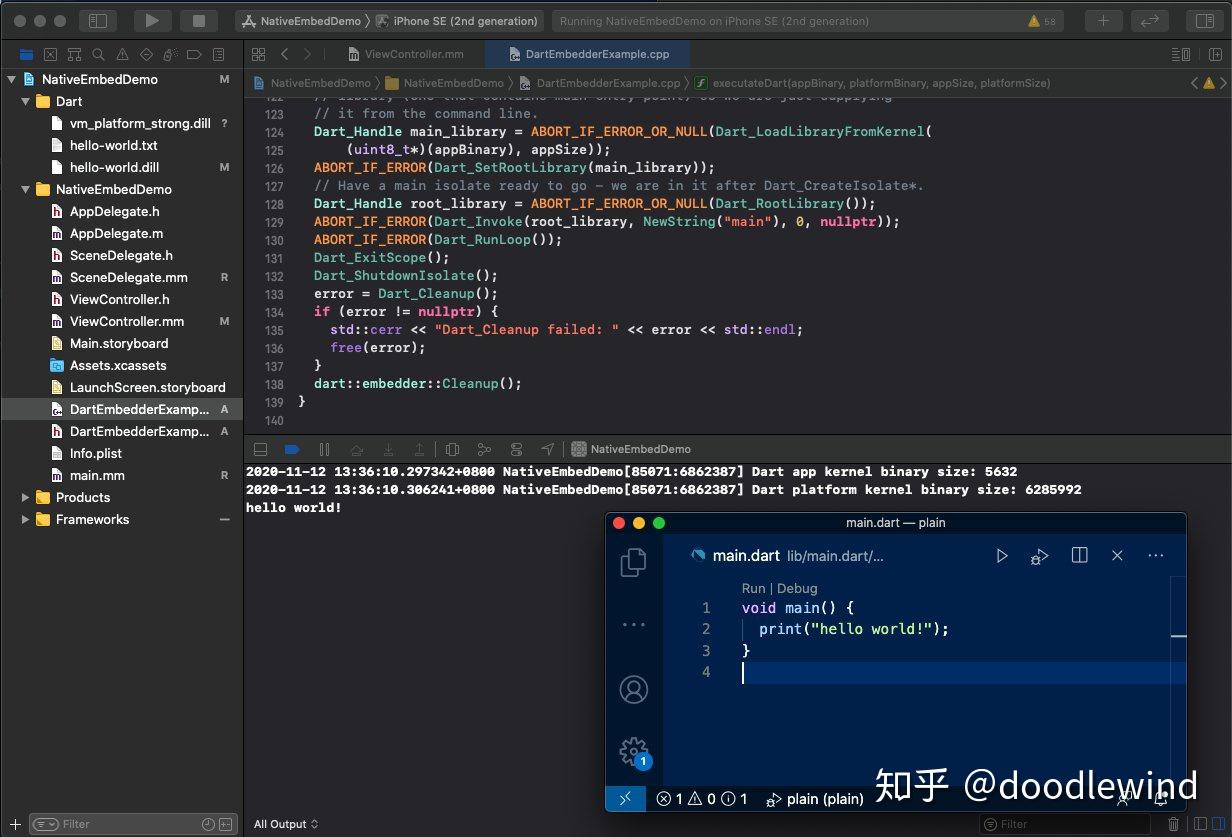 pathForResource方法,将上面这两个.dill格式文件打开为char *形式的 buffer,将它们输入前面集成 Dart VM 的 C++ Demo。 - 执行同样的 Embedding Example C++ 入口函数。