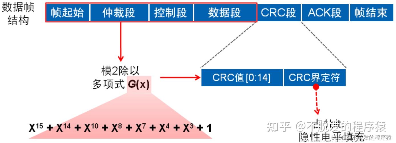 CRC段是检查帧传输错误的帧,包括:15 个位的 CRC序列(CRC SEQUENCE)和1 个位的CRC界定符(CRC DELIMITER)构成。