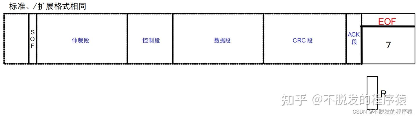 - 仲裁段:表示该帧优先级的段,根据仲裁段ID码长度的不同,分为标准帧(CAN 2.0A)和扩展帧(CAN 2.0B);
