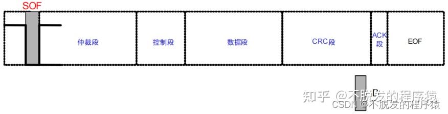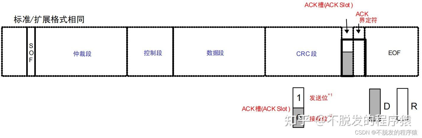 ACK段用来确认是否正常接收。由 ACK 槽(ACK SLOT)和 ACK 界定符(ACK DELIMITER)2 个位构成。