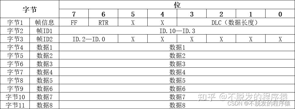 CAN标准帧帧信息是11字节,包括帧描述符和帧数据两部分。如下表所列: