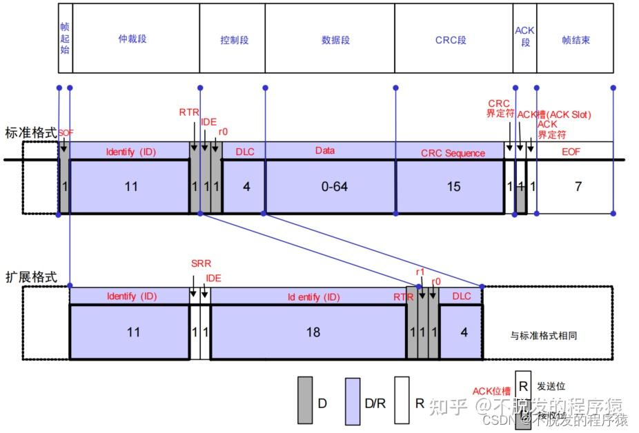 仲裁段在标准格式帧和扩展格式帧中有所不同。标准格式帧的仲裁段由11位标识符和远程发送请求位RTR组成,扩展格式帧的仲裁场由29位标识符和远程发送请求位RTR组成。