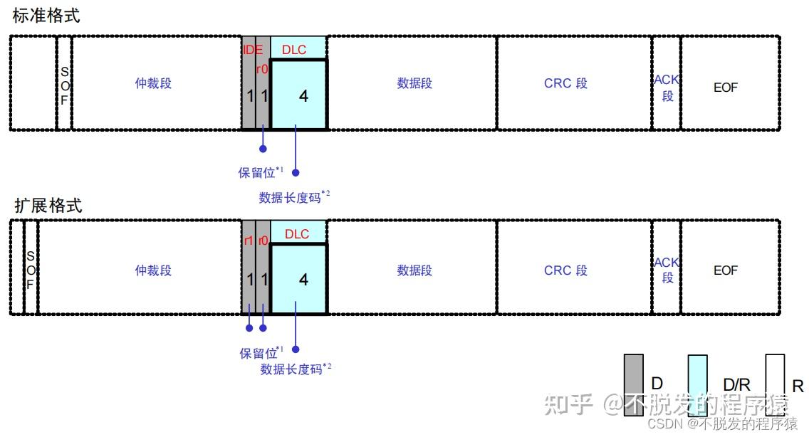 保留位(r0、r1)必须全部以显性电平发送。但接收方可以接收显性、隐性及其任意组合的电平。