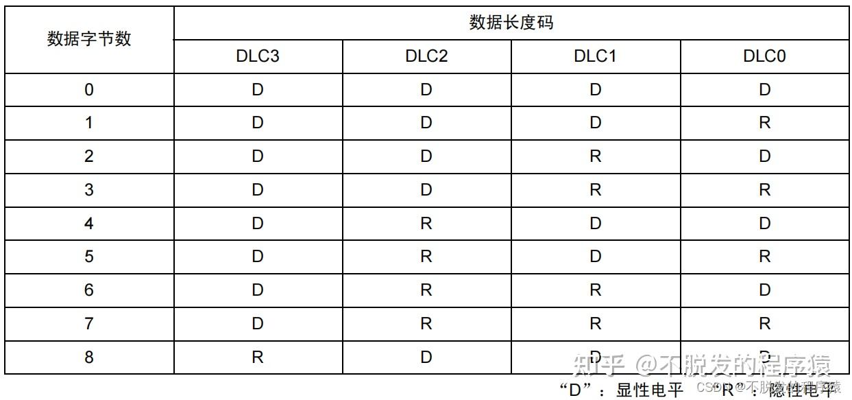 数据长度码(DLC)与数据的字节数的对应关系如下表所示: