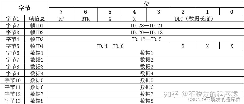 CAN扩展帧帧信息是13字节,包括帧描述符和帧数据两部分,如下表所示: