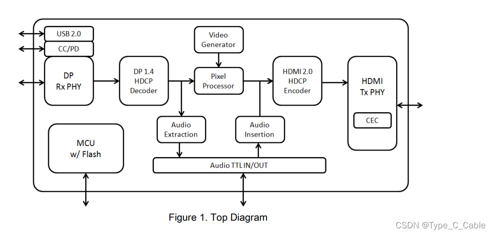 通过USB Type-C连接器将DP RX视频信号转换为HDMI/DVI TX视频信号。。