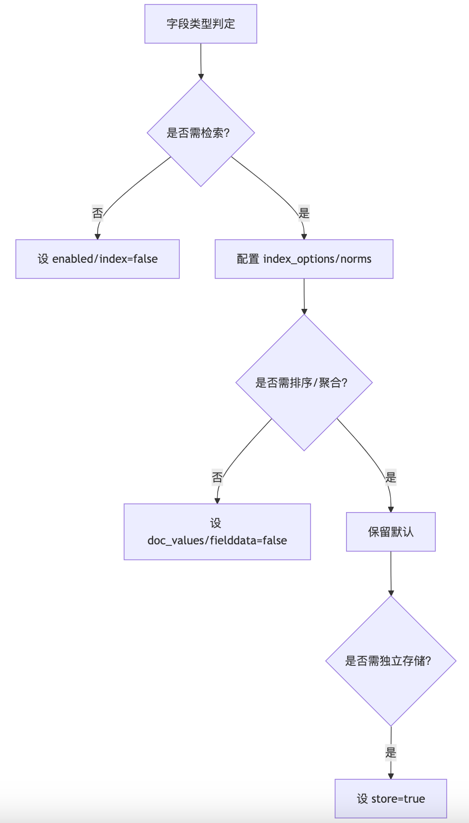 false/strict,避免字段污染PUT /your_index { "mappings": { "dynamic": "strict", // 生产环境必选 "properties": { ... } } } - 字段设置流程: