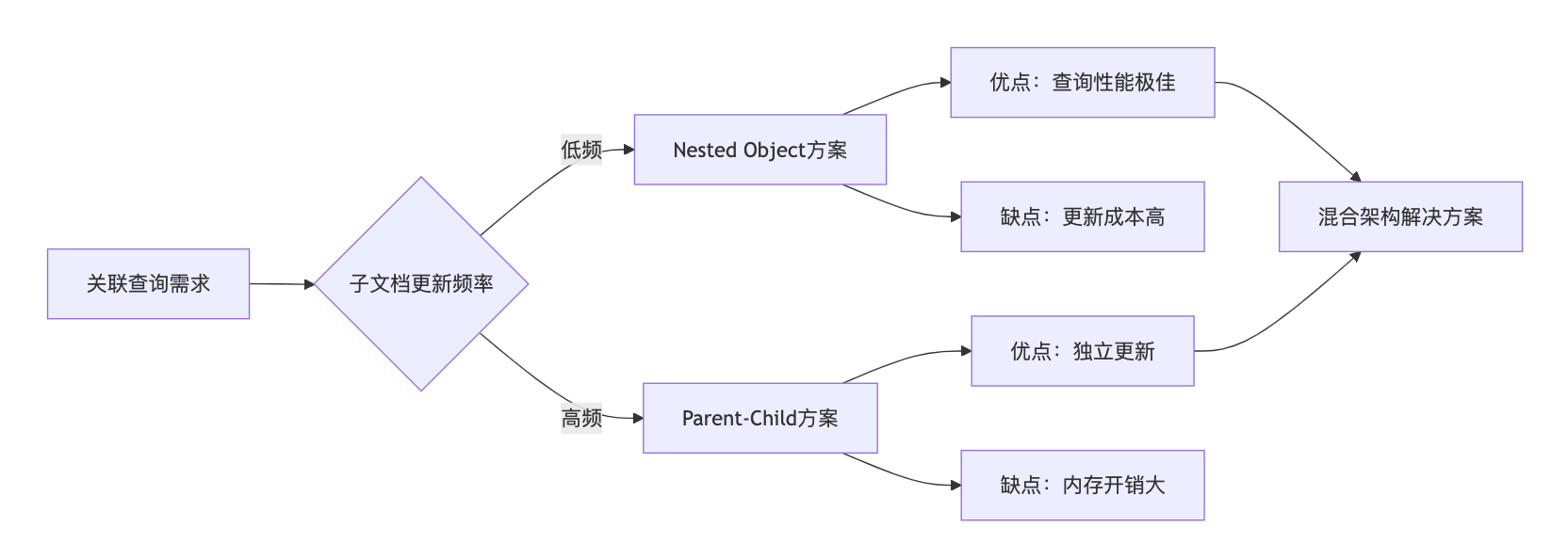 通用建议:优先使用Nested Object(因性能优势),仅在子文档更新极频繁时选用Parent-Child