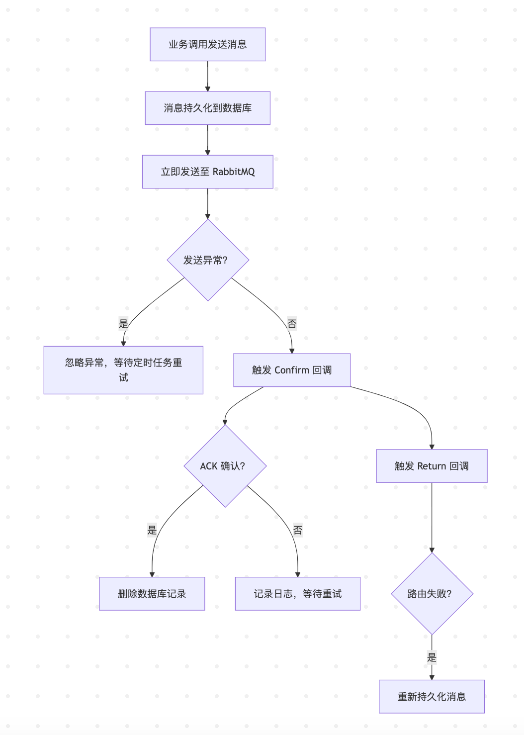 - 实现:调用发送接口时,先将消息存入数据库,生成唯一ID(如UUID)记录交换器、路由键、消息体及发送次数(初始为0)。