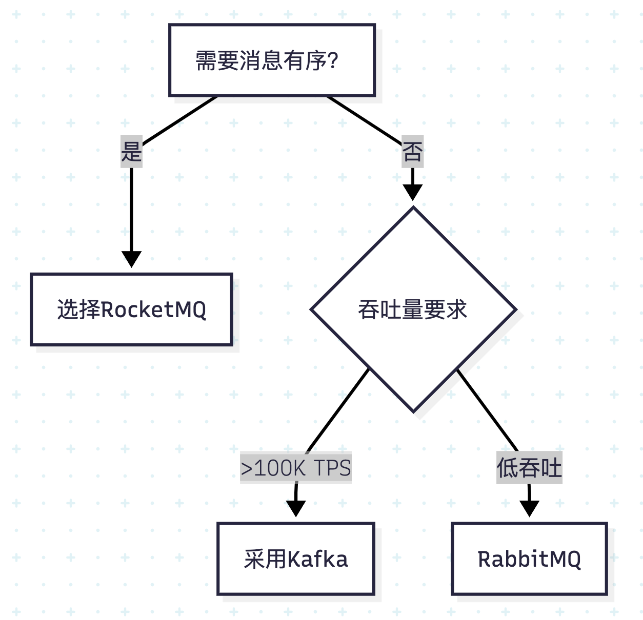场景选择原则:优先采用Kafka当需求满足:① 高吞吐要求 ② 历史数据复用 ③ 容忍局部无序。强有序场景需选用其他方案