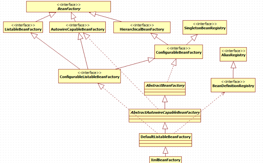 (4)ConfigurableListableBeanFactory是一个更强大的接口,继承了上述的所有接口,无所不包,称为四级接口。(这4级接口是BeanFactory的基本接口体系。