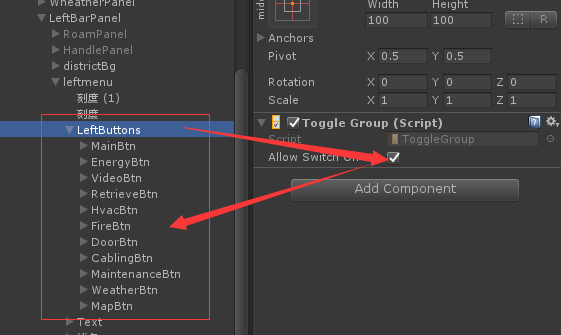 LeftButtons上添加Toggle Group组件,属性Allow Switch Off打对勾,代表它的所有子物体上带有Toggle组件的属性Is On是关闭状态。
