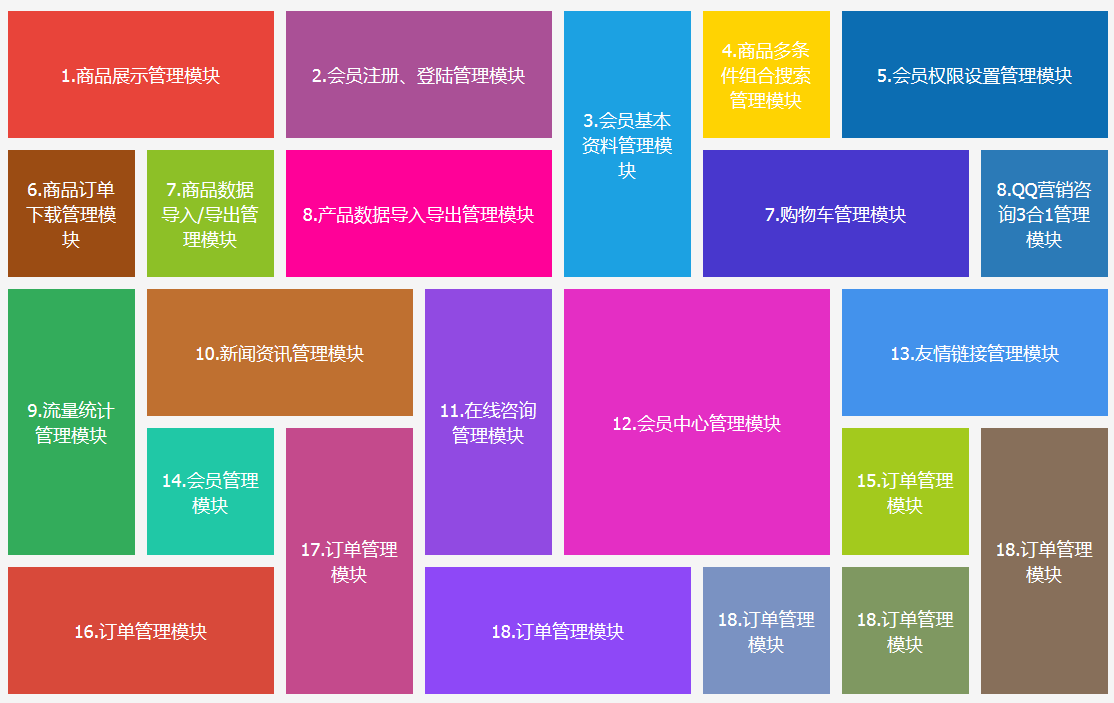 <div class="s-mod w1100" style="height:710px"> <div class="s-mod-loding"><img src="images/loading_d.gif"></div> <ul> <li class="s-mod-item" w="266" h="127" l="0" t="0" bg="#e8443a" cbg="#d92e24"> <div class="s-mod-wrap"> <div class="s-mod-def"><span>1.商品展示管理模块</span></div> <div class="s-mod-cur"><span>自主添加产品类别,不限级数。后台对产品实现增、查、删、改等功能。前端对产品进行列表展示、详细页面展示。详细页面包含产品小图、大图、详细参数、文字内容介绍、多图滚动展示、图片放大展示、关联资讯介绍展示。</span></div> </div> </li> <li class="s-mod-item" w="266" h="127" l="278" t="0" bg="#aa5096" cbg="#922a7b"> <div class="s-mod-wrap"> <div class="s-mod-def"><span>2.会员注册、登陆管理模块</span></div> <div class="s-mod-cur"><span>管理会员注册信息、会员列表,建立会员等级权限组,分配会员至权限组,然后根据权限使用网站的其它各个功能模块。</span></div> </div> </li> <li class="s-mod-item" w="127" h="266" l="556" t="0" bg="#1CA1E2" cbg="#1182BA"> <div class="s-mod-wrap"> <div class="s-mod-def"><span>3.会员基本资料管理模块</span></div> <div class="s-mod-cur"><span>对会员注册的基本资料进行查看、修改。</span></div> </div> </li> <li class="s-mod-item" w="127" h="127" l="695" t="0" bg="#FFD302" cbg="#EAC203"> <div class="s-mod-wrap"> <div class="s-mod-def"><span>4.商品多条件组合搜索管理模块</span></div> <div class="s-mod-cur"><span>在产品列表页面实现对产品按照价格、尺寸、日期、型号、产地等多条件字段组合搜索功能。</span></div> </div> </li> <li class="s-mod-item" w="266" h="127" l="834" t="0" bg="#0C6DB2" cbg="#09578E"> <div class="s-mod-wrap"> <div class="s-mod-def"><span>5.会员权限设置管理模块</span></div> <div class="s-mod-cur"><span>管理会员注册信息、会员列表,建立会员等级权限组,分配会员至权限组,然后根据权限使用网站的其它各个功能模块。</span></div> </div> </li> <li class="s-mod-item" w="127" h="127" l="0" t="139" bg="#9B4C13" cbg="#8F4108"> <div class="s-mod-wrap"> <div class="s-mod-def"><span>6.商品订单下载管理模块</span></div> <div class="s-mod-cur"><span>将企业产品手册、说明书、宣传画册等资料上传至网站,用户通过网站下载,可分用户权限实现下载控制,需与会员管理系统配合。</span></div> </div> </li> <li class="s-mod-item" w="127" h="127" l="139" t="139" bg="#8DC027" cbg="#76A31B"> <div class="s-mod-wrap"> <div class="s-mod-def"><span>7.商品数据导入/导出管理模块</span></div> <div class="s-mod-cur"><span>在网站管理平台对产品型号、类别、价格;产品图片等数据进行批量上传,批量下载的管理。</span></div> </div> </li> <li class="s-mod-item" w="266" h="127" l="278" t="139" bg="#FF0198" cbg="#D80683"> <div class="s-mod-wrap"> <div class="s-mod-def"><span>8.产品数据导入导出管理模块</span></div> <div class="s-mod-cur"><span>在网站管理平台对产品型号、类别、价格;产品图片等数据进行批量上传,批量下载的管理。</span></div> </div> </li> <li class="s-mod-item" w="266" h="127" l="695" t="139" bg="#4837cd" cbg="#3c2bb7"> <div class="s-mod-wrap"> <div class="s-mod-def"><span>7.购物车管理模块</span></div> <div class="s-mod-cur"><span>包含在线订购单提交,可在线提交单个或连续多个订单,在线支付、物流管理、退换货管理。必须与会员系统配合。</span></div> </div> </li> <li class="s-mod-item" w="127" h="127" l="973" t="139" bg="#2b7ab7" cbg="#1e669d"> <div class="s-mod-wrap"> <div class="s-mod-def"><span>8.QQ营销咨询3合1管理模块</span></div> <div class="s-mod-cur"><span>可以把QQ、MSN、旺旺做成一个3合1的滚动窗口,用户点击可与企业洽谈生意,通过此系统大大方便访客与企业的交流。</span></div> </div> </li> <li class="s-mod-item" w="127" h="266" l="0" t="278" bg="#33ac5b" cbg="#209747"> <div class="s-mod-wrap"> <div class="s-mod-def"><span>9.流量统计管理模块</span></div> <div class="s-mod-cur"><span>集成第三方提供的网站流量统计系统,通过统计可以可看网站的访问量,以及互联网品牌指数。</span></div> </div> </li> <li class="s-mod-item" w="266" h="127" l="139" t="278" bg="#bf7030" cbg="#ae6021"> <div class="s-mod-wrap"> <div class="s-mod-def"><span>10.新闻资讯管理模块</span></div> <div class="s-mod-cur"><span>不限层级添加新闻资讯类别,可自主管理公司简介、公司新闻、产品新闻、行业知识等。在后台进行增、删、查、改等一系列操作。</span></div> </div> </li> <li class="s-mod-item" w="127" h="266" l="417" t="278" bg="#914ae2" cbg="#7d33d0"> <div class="s-mod-wrap"> <div class="s-mod-def"><span>11.在线咨询管理模块</span></div> <div class="s-mod-cur"><span>实现网站前台页面提交咨询内容及联系方式,后台查询咨询内容及咨询人情况,并进行在线咨询的回复,前台页面自动显示。</span></div> </div> </li> <li class="s-mod-item" w="266" h="266" l="556" t="278" bg="#e42ec4" cbg="#cf19af"> <div class="s-mod-wrap"> <div class="s-mod-def"><span>12.会员中心管理模块</span></div> <div class="s-mod-cur"><span>实现会员填写字段注册,对填写内容进行有效性校验。 根据注册信息的用户名、密码、验证码进行会员登陆。 对会员注册的基本资料进行查看、修改。 管理会员注册信息、会员列表,建立会员等级权限组,分配会员至权限组,然后根据权限使用网站的其它各个功能模块。</span></div> </div> </li> <li class="s-mod-item" w="266" h="127" l="834" t="278" bg="#4392ec" cbg="#206fc8"> <div class="s-mod-wrap"> <div class="s-mod-def"><span>13.友情链接管理模块</span></div> <div class="s-mod-cur"><span>与客户网站交换文字链接、图片链接均可,通过链