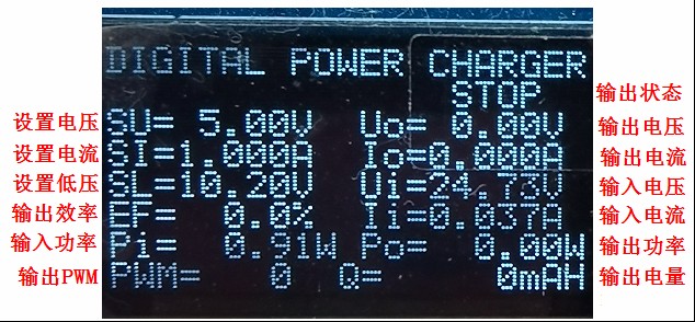 通过按键调整输入电压低压保护电压、输出电压、输出电流限流值、清零容量mAH。
