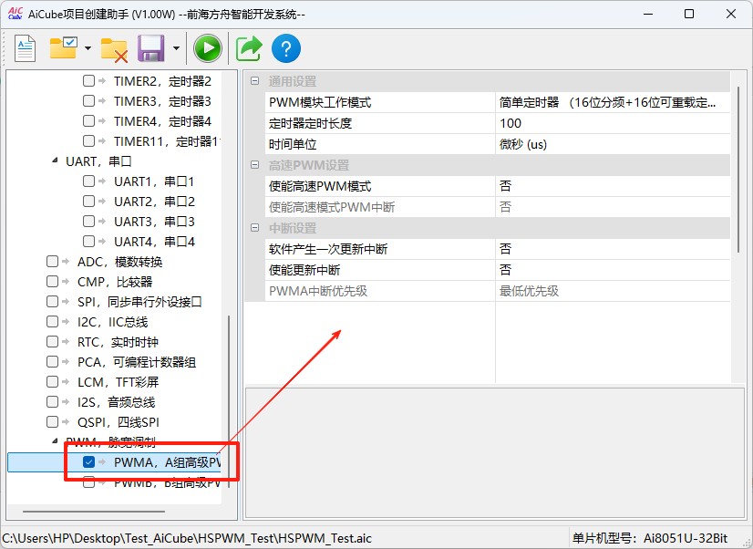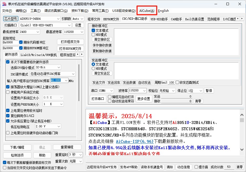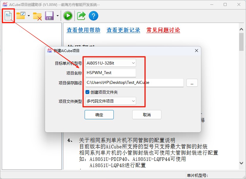 点击AiCube界面中的新建项目按钮,选择“Ai8051U-32Bit”型号