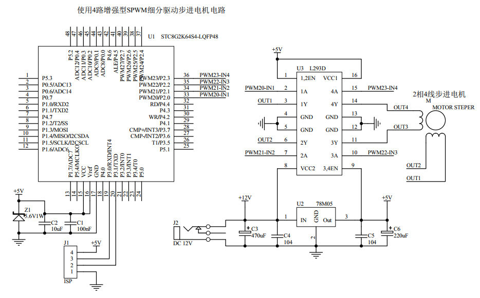 PWM: 4路PWM20~PWM23分别从P2.0 P2.1 P2.2 P2.3输出驱动步进电机.
