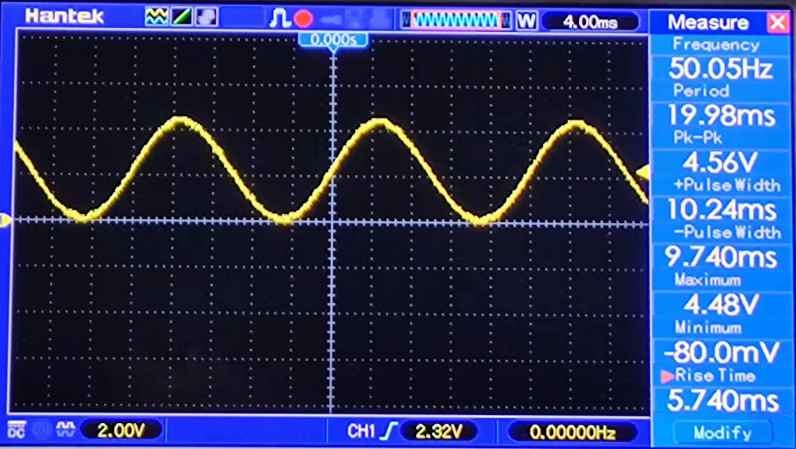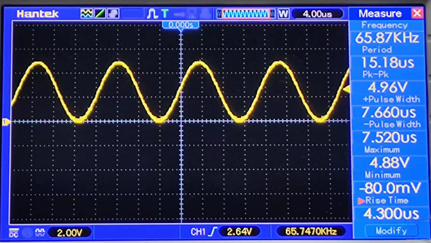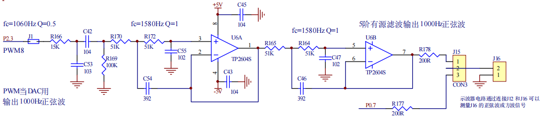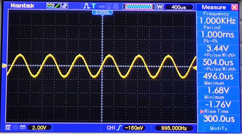 2. 使用老梁示波器的信号发生器,PWM输出脉冲经过5阶有源滤波输出1KHz正弦波: