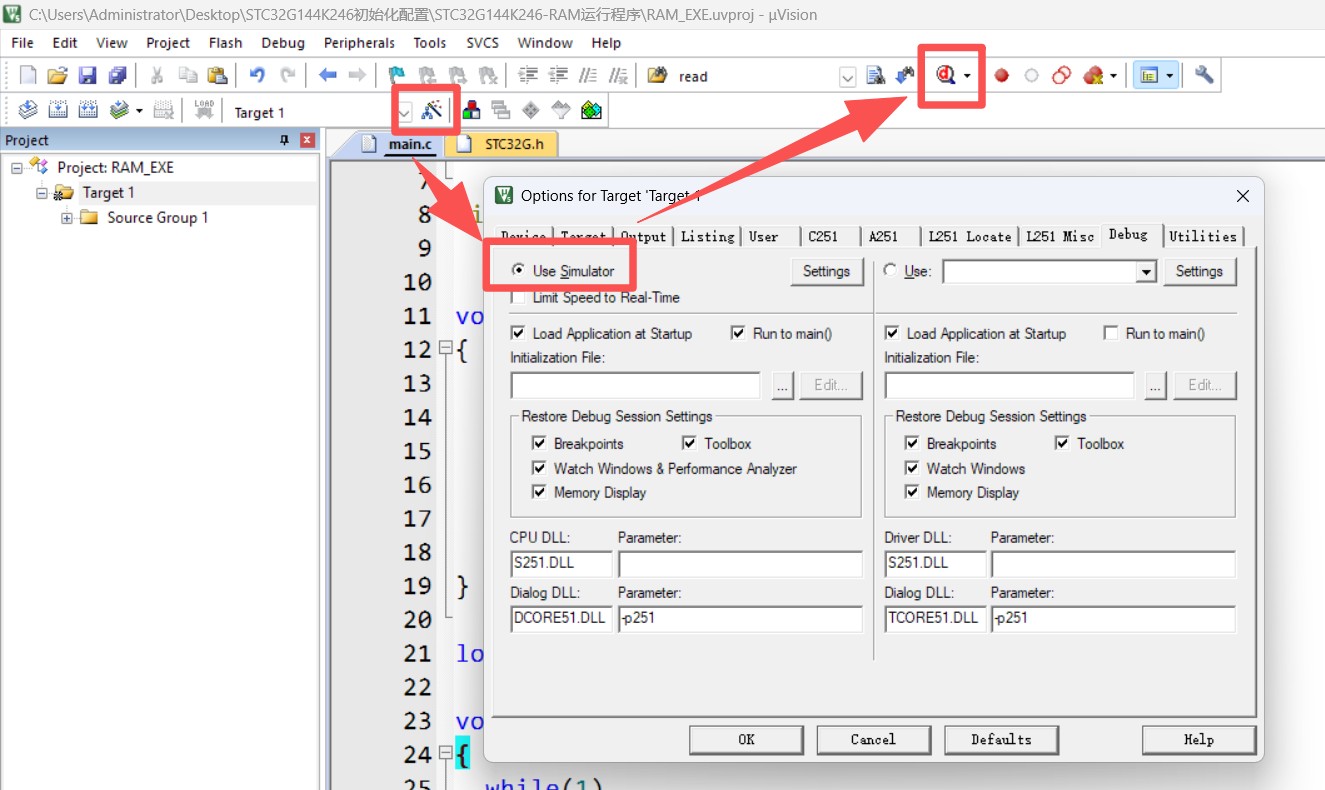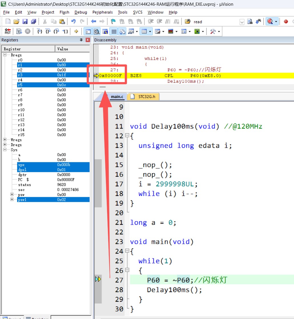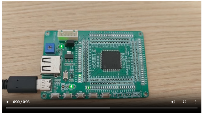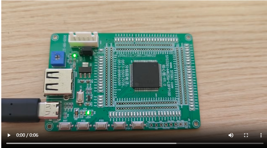 51, RAM中运行程序@120MHz, STC32G144K246 | 从QSPI直接运行程序开发中 本例程使用内部24MHz高速时钟,经过HPLL1倍频到120MHz后,给系统时钟使用 另有实际测试:同样的一段计算函数(1000次整数乘法和加法),计算时关闭总中断 主程序120MHz消耗了200us, 而在RAM内运行消耗了124us(此时WTST设置失效,零等待执行),速度提高了38% 程序拥有两种方式来载入RAM程序,一种是同一个工程中,通过对函数取地址来获取程序内容。这种方法在调用其他函数的时候,本质还是会跳转回到FLASH部分运行 第二种是使用独立的工程来编译RAM中需要运行的程序,这部分通过设置程序整体偏移地址为0x800000实现,同时通过hex2bin.exe实现自动转为bin文件,这个编译后的bin文件通过“打开EEPROM文件”载入即可使用 使用同一工程的方式,效果是P32和P35闪烁,长按P32按键后,P32、P35停止闪烁。这部分程序是主程序,非RAM内运行 如果按下P33按键,则跳转到RAM内运行程序,效果是P6上持续自减数值,也就是二进制不断刷新显示。