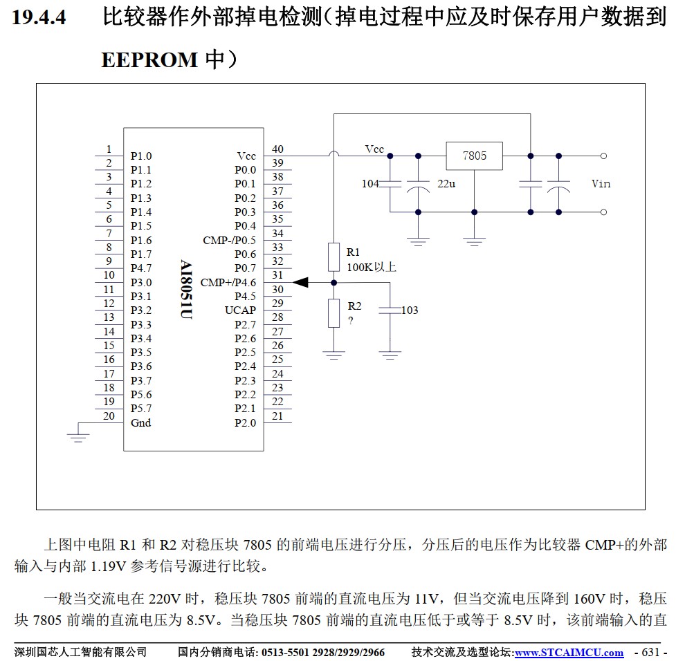 要保证时间足够,就是调整外部电压偏低检测中断的提前量,如 1, 交流220V, 7805稳压电路前端输入是 11V; 2, 交流210V, 7805稳压电路前端输入是 10.5V; 3, 交流200V, 7805稳压电路前端输入是 10V; 4, 交流190V, 7805稳压电路前端输入是 9.5V; 5, 交流180V, 7805稳压电路前端输入是 9V; 6, 交流170V, 7805稳压电路前端输入是 8.5V; 7, 交流160V, 7805稳压电路前端输入是 8V; ===你这个要提前的量放在 11V/10.5V/10V/9.5V/9V/8.5V ? ===哪个电压点产生外部电压偏低检测中断, 确保时间充分要通过实践测试来选择