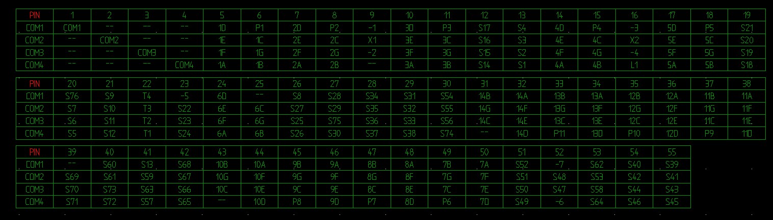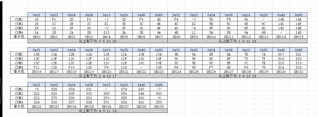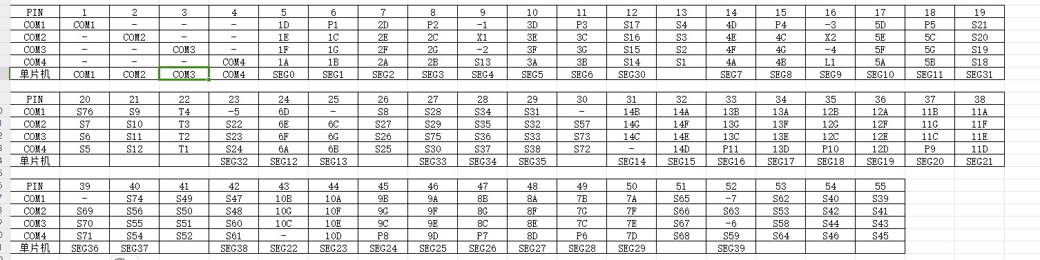 这里帮大家整理好了一个表格,分为了三块显示,每块的第一行是段码屏的引脚号,第二三四五行使单片机的com对应的显示的图标号,最后一行就是连接的单片机的引脚,因为这个图是按照段码屏的序号排布的不太好看,我给他整理了下,按照单片机的seg号排布,排列玩之后如下: