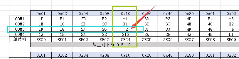 例2:要想点亮“-2”所在的图标就是LCD_buff[10] |= 0x10;