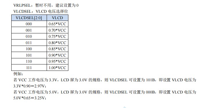 4.电压配置,这里单片机VCC是5v,屏的电压是3.3v,所以VLCDSEL可以直接设置为0,即5*0.65 = 3.25V。