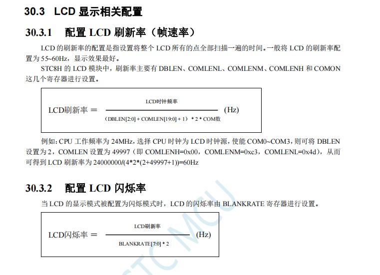 - COMLNTHM = 0x86; // COM时间长度设置 中字节COMLEN[15:8] LCD刷新率 = LCD时钟频率 / ((DBLEN[2:0]+COMLEN[19:0]+1) *2 * COM数)