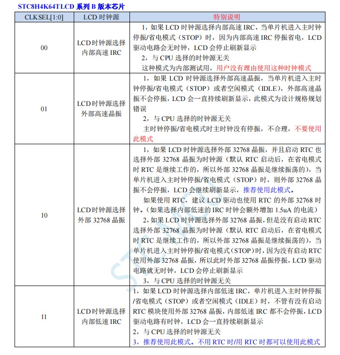 - LCDCFG = 0x00 + 0; // 0x00:选择CPU时钟为LCD时钟, 0x80: 选择外部32K晶振做时钟. VLCD电压选择0~7对应0.65+VLCD*0.05.