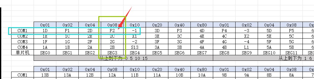可以看到这里还是三块,第一块16个seg口就是,从seg0-seg15,可以看到这里最上面多可一行16进制数,最下面一行多了个中文。这个怎么理解呢,以第一个为例,看到“从上到下为 0 5 10 15”这个文字所在的那八列,其中横着的COM0对应的那一行就是对应的LCD_buff[0]数组对应的显示内容,横着的COM1对应的那一行就是对应的LCD_buff[5]数组对应的显示内容,横着的COM2对应的那一行就是对应的LCD_buff[10]数组对应的显示内容,横着的COM3对应的那一行就是对应的LCD_buff[15]数组对应的显示内容,且写1点亮 例1:要想点亮“P2”所在的图标就是LCD_buff[0] |= 0x08;