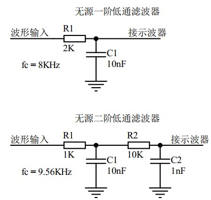 无源二阶RC低通滤波: 1K+10nF,10K+1nF。
